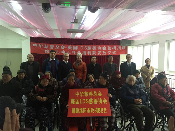 12月7日正值大雪时节,我市已渐渐进入严冬,但绵阳市中心社会福利院老人们的心里却感到异常温暖。中华慈善总会和美国LDS慈善协会通过四川省慈善总会,为包括市中心福利院在内的我市88名困难老人每人捐赠一台轮椅的捐赠仪式在该院隆重举行。中华慈善总会外联部项目专员刘晓嘉,美国LDS慈善协会中国区总监阿仕顿先生,美国LDS慈善协会中国区总监助理阿仕顿夫人,省慈善总会会长苟兴元先生,省慈善总会副秘书长、省慈善总会办公室副主任郑平先生和市民政局副局长朱章元先生出席仪式。绵阳市慈善总会、绵阳市中心社会福利院相关人员和市中心福利院受助老人等共80余人参加捐赠仪式。